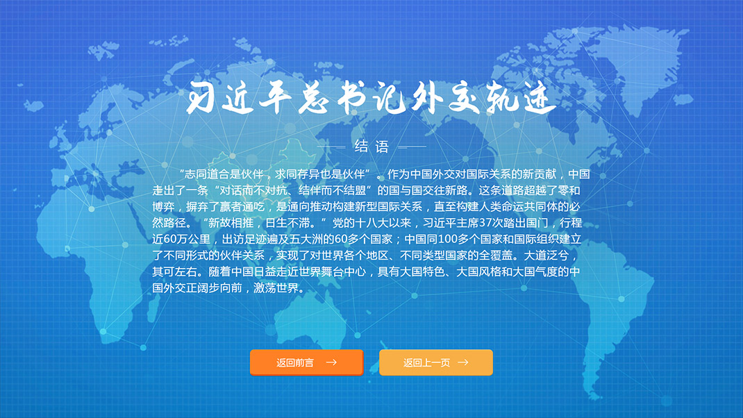 大(da)連理(li)工(gong)大(da)學(xué)觸屏係(xi)統由大(da)連仟億科(ke)技(ji)有(yǒu)限(xian)公(gōng)司進(jin)行開髮(fa),主(zhu)要包括兩箇(ge)係(xi)統,第一(yi)箇(ge)爲(wei)一(yi)帶一(yi)路,第二箇(ge)爲(wei)大(da)國(guo)外交,習近平主(zhu)席出訪足迹遍及(ji)五大(da)洲,他(tā)頻密的(de)外交日(ri)程(cheng),标注了(le)中(zhong)國(guo)與世界關係(xi)的(de)嶄新(xin)坐(zuò)标。中(zhong)國(guo)積極髮(fa)展(zhan)全球夥伴關係(xi),努力(li)構建(jian)總體(ti)穩定、均衡髮(fa)展(zhan)的(de)大(da)國(guo)關係(xi)不斷(duan)…
